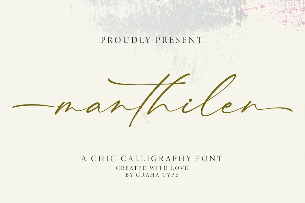 Manthilen is an elegant calligraphy font with smooth, flowing lines and soft curves, crafted to bring a sense of luxury and refinement to any design. Its combination of timeless elegance and contemporary style makes it the perfect choice for branding, stylish wedding invitations, and premium print materials. Whether you're creating a logo, designing an invitation, or working on upscale promotional materials, Manthilen adds a touch of sophistication and beauty to your project.